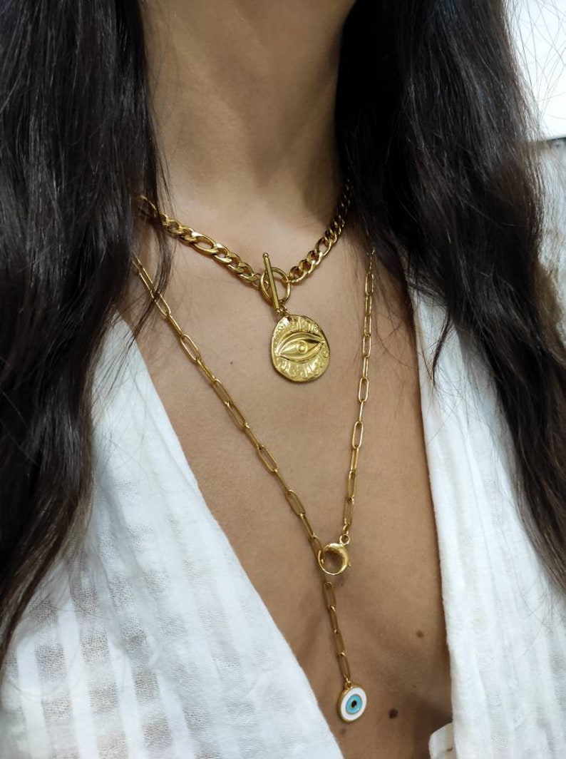 18k gold-plated stainless steel Two-year quality and plating gu Solid Gold Evil Eye Necklace, Dainty 14K Gold Necklace, Minimal, Bridal Necklace, Tiny Ivory Evil Eye, Solid Gold Evil Eye, Women Day Gift (1.2k) Sale Price $176.47 $ 176.47 $ 220.59 Original Price $220.59 (20% off) FREE shipping Add to Favorites. Gold Coin Evil Eye Pendant Necklace In Sterling Silver